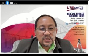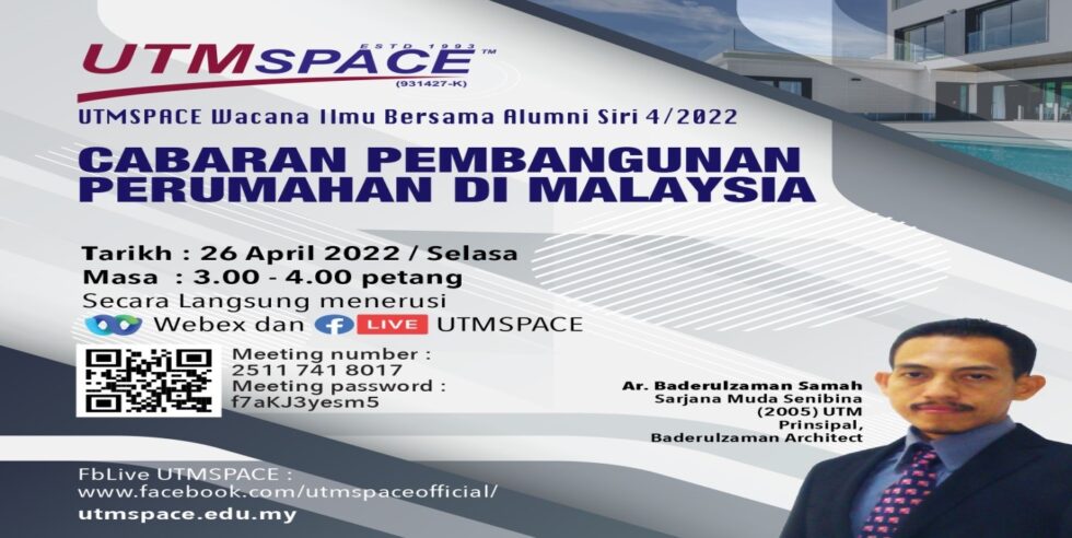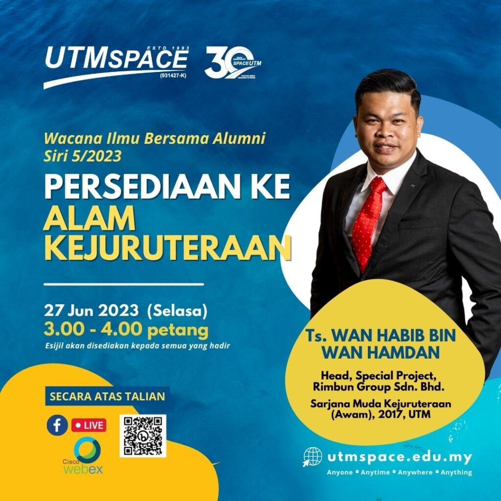 27 Jun 2023 – UTMSPACE telah menjemput Ts. Wan Habib Bin Wan Hamdan yang merupakan Ketua Projek Khas dari Rimbun Group Sdn. Bhd. untuk memberikan perkongsian kepada warga UTM/UTMSPACE menerusi FB Live UTMSPACE dan Webex dalam program UTMSPACE Wacana Ilmu Bersama Alumni Siri 5/2023. Program ini telah dihadiri seramai 42 orang penonton secara atas talian. Beliau juga merupakan Alumni UTM bagi program Sarjana Muda Kejuruteraan (Awam) (2017) UTM. Program ini telah berlangsung pada jam 3 petang sehingga 4 petang.
