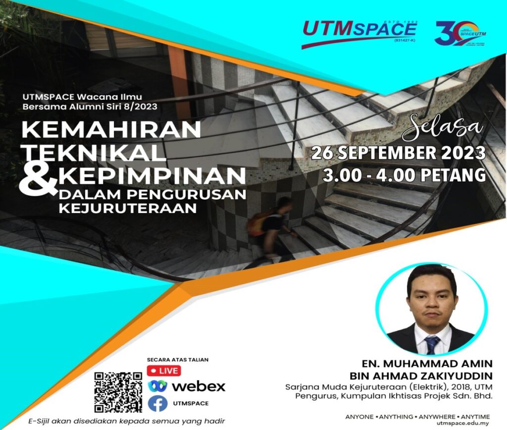 26 September 2023 – UTMSPACE telah menjemput En. Muhammad Amin Bin Ahmad Zakiyuddin yang merupakan Pengurus dari Kumpulan Ikhtiasa Projek Sdn. Bhd. untuk memberikan perkongsian kepada warga UTM/UTMSPACE menerusi FB Live UTMSPACE dan Webex dalam program UTMSPACE Wacana Ilmu Bersama Alumni Siri 8/2023. Program ini telah dihadiri seramai 38 orang penonton secara atas talian. Beliau juga merupakan Alumni UTM bagi program Sarjana Muda Kejuruteraan (Elektrik) (2018) UTM. Program ini telah berlangsung pada jam 3 petang sehingga 4 petang.