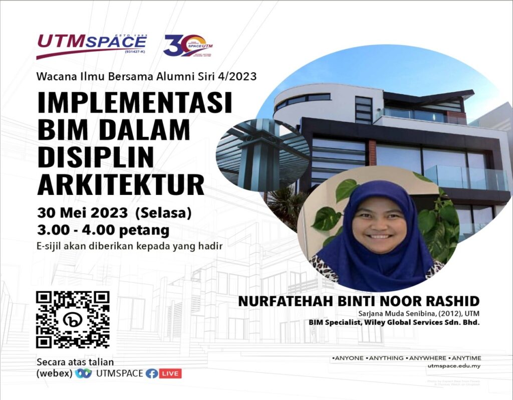 30 Mei 2023 – UTMSPACE telah menjemput Pn. Nurfatehah binti Noor Rashid yang merupakan BIM Specialist dari Wiley Global Services Sdn. Bhd. untuk memberikan perkongsian kepada warga UTM/UTMSPACE menerusi FB Live UTMSPACE dan Webex dalam program UTMSPACE Wacana Ilmu Bersama Alumni Siri 4/2023. Program ini telah dihadiri seramai 60 orang penonton secara atas talian. Beliau juga merupakan Alumni UTM bagi program Sarjana Muda Senibina (2012) UTM. Program ini telah berlangsung pada jam 3 petang sehingga 4 petang.