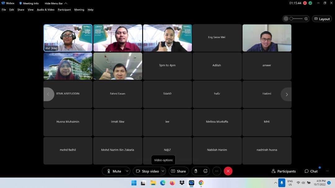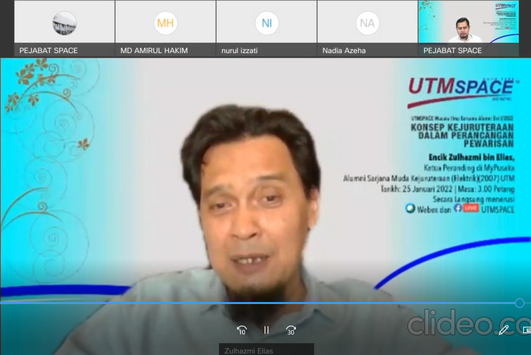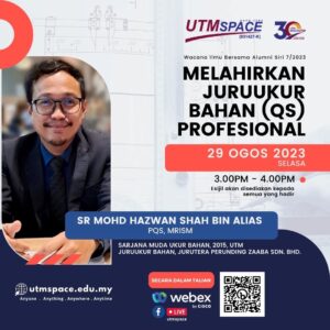 29 Ogos 2023 – UTMSPACE telah menjemput Sr Mohd Hazwan Shah Bin Alias yang merupakan Juruukur Bahan dari Jurutera Perunding Zaaba Sdn. Bhd. untuk memberikan perkongsian kepada warga UTM/UTMSPACE menerusi FB Live UTMSPACE dan Webex dalam program UTMSPACE Wacana Ilmu Bersama Alumni Siri 7/2023. Program ini telah dihadiri seramai 75 orang penonton secara atas talian. Beliau juga merupakan Alumni UTM bagi program Sarjana Muda Ukur Bahan (2015) UTM. Program ini telah berlangsung pada jam 3 petang sehingga 4 petang.