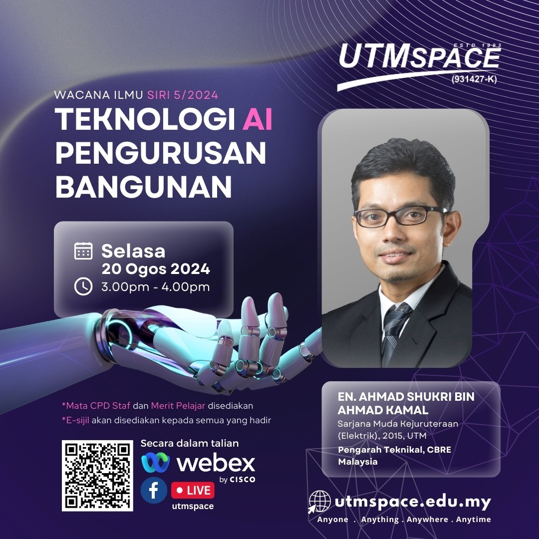 20 Ogos 2024 – UTMSPACE telah menganjurkan Wacana Ilmu Bersama Alumni Siri 5/2024. Program ini juga diadakan pada jam 3.00 petang sehingga 4.00 petang yang disiarkan secara langsung di FB UTMSPACE dan Webex.