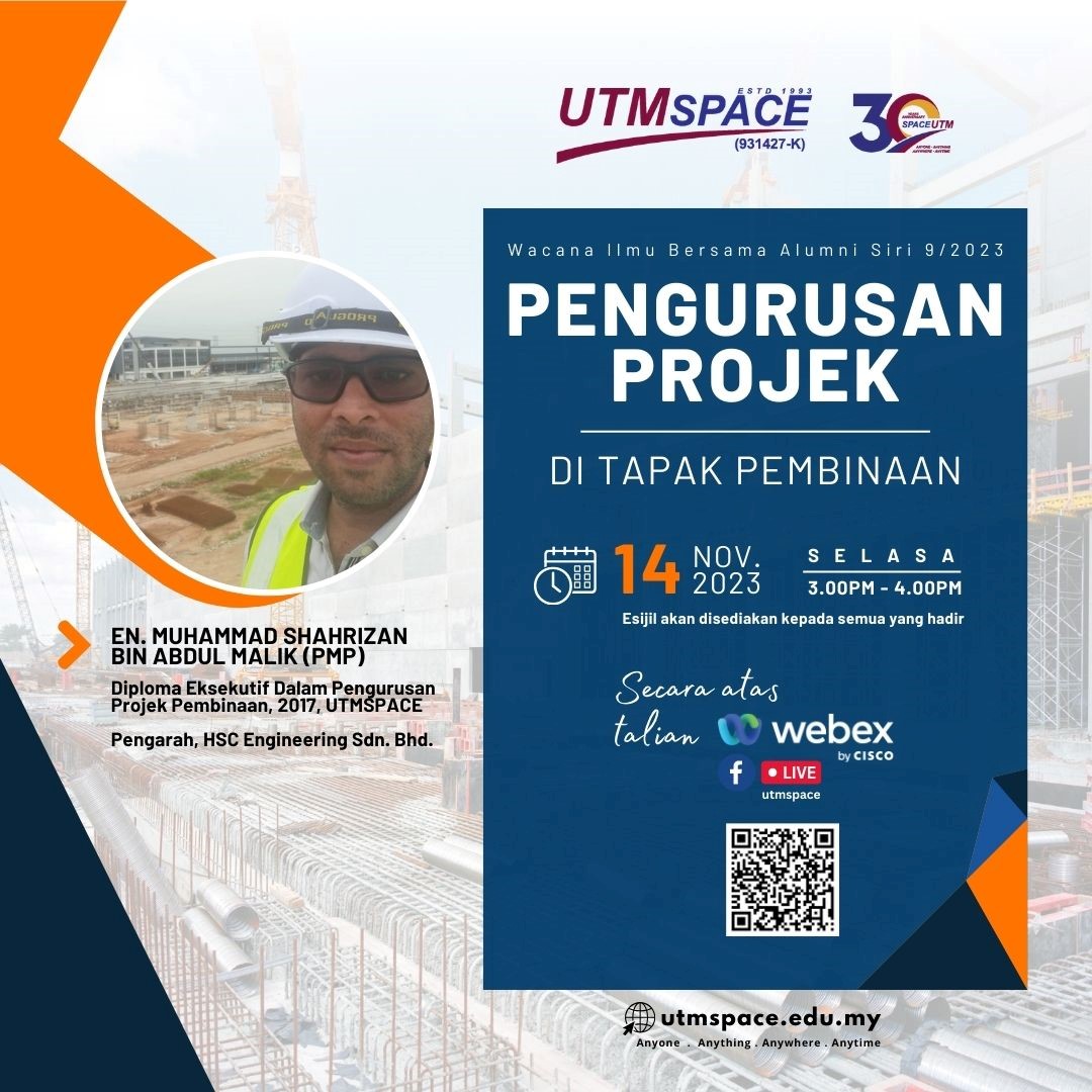14 November 2023 – UTMSPACE telah menganjurkan Wacana Ilmu Bersama Alumni Siri 9/2023. Program ini juga diadakan pada jam 3.00 petang sehingga 4.00 petang yang disiarkan secara langsung di FB UTMSPACE dan Webex. Wacana ini telah disampaikan oleh Alumni UTMSPACE iaitu En. Muhammad Shahrizan Bin Abdul Malik merupakan Pengarah di HSC Engineering Sdn. Bhd. Beliau juga dianugerahkan Diploma Eksekutif Dalam Pengurusan Projek Pembinaan pada tahun 2017.