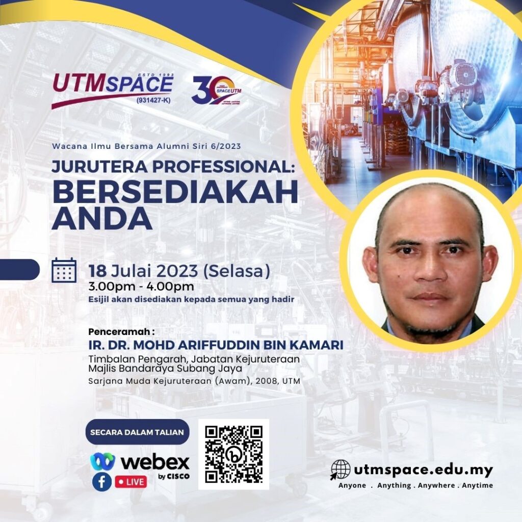18 Julai 2023 – UTMSPACE telah menjemput Ir. Dr. Mohd Ariffuddin Bin Kamari yang merupakan Timbalan Pengarah Jabatan Kejuruteraan dari Majlis Bandaraya Subang Jaya untuk memberikan perkongsian kepada warga UTM/UTMSPACE menerusi FB Live UTMSPACE dan Webex dalam program UTMSPACE Wacana Ilmu Bersama Alumni Siri 6/2023. Program ini telah dihadiri seramai 46 orang penonton secara atas talian. Beliau juga merupakan Alumni UTM bagi program Sarjana Muda Kejuruteraan (Awam) (2008) UTM. Program ini telah berlangsung pada jam 3 petang sehingga 4 petang.