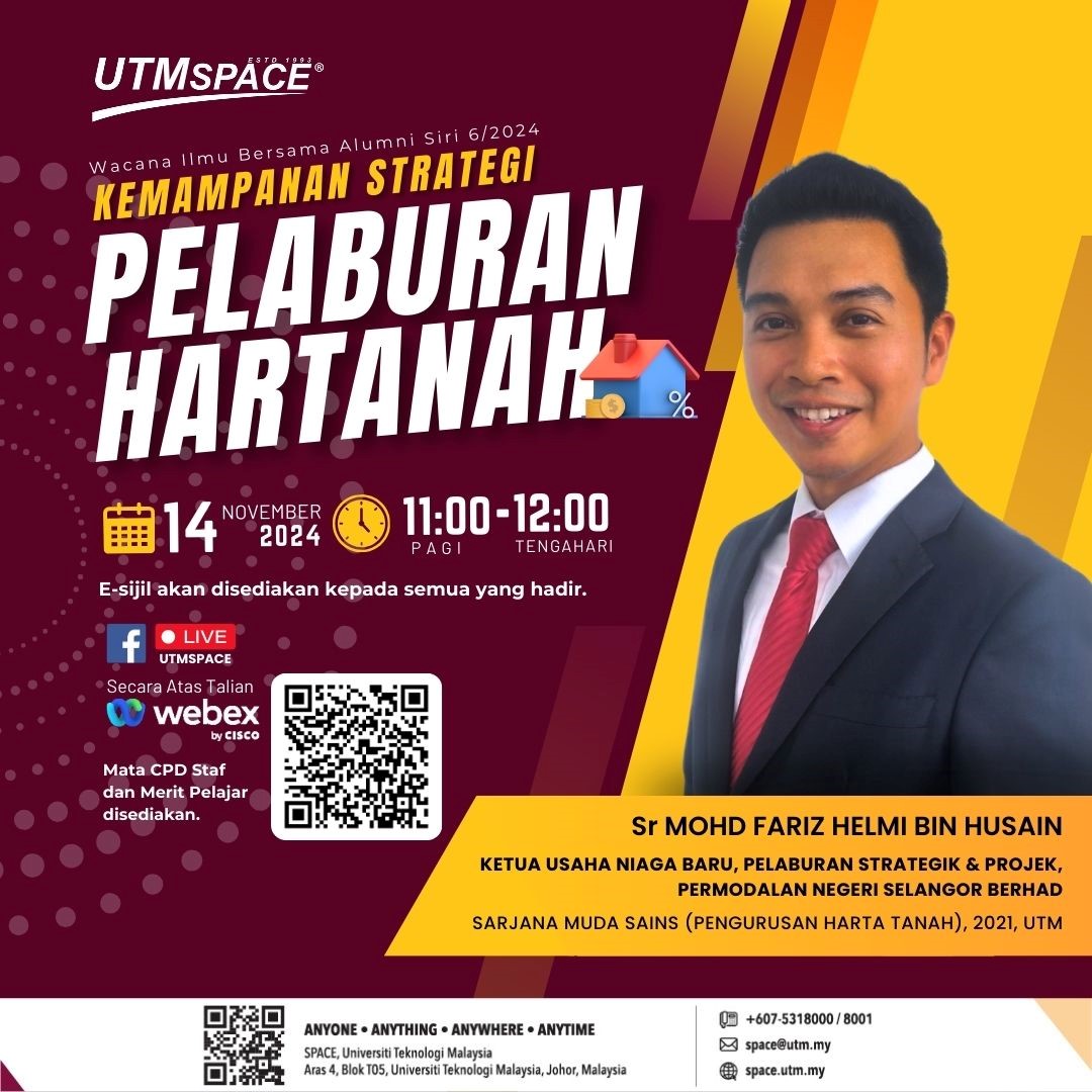 14 November 2024 – UTMSPACE telah menganjurkan Wacana Ilmu Bersama Alumni Siri 6/2024. Program ini juga diadakan pada jam 11.00 pagi yang disiarkan secara langsung di FB UTMSPACE dan Webex. Wacana ini juga telah disampaikan oleh Alumni UTM iaitu Sr Mohd Fariz Helmi bin Husain merupakan Ketua Usaha Niaga Baru, Pelaburan Strategik dan Projek di Permodalan Negeri Selangor Berhad. Beliau juga telah dianugerahkan Sarjana Muda Sains (Pengurusan Harta Tanah), 2021, UTM. Wacana sesi ini juga mencatatkan kehadiran atas talian seramai 30 orang.