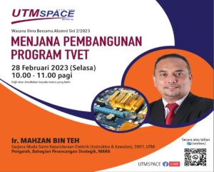 UTMSPACE telah menjemput Ir. Mahzan bin Teh, Pengarah, Bahagian Pengurusan Strategik, MARA untuk memberikan perkongsian kepada warga UTM/UTMSPACE menerusi FB Live UTMSPACE dan Webex dalam program UTMSPACE Wacana Ilmu Bersama Alumni Siri 2/2023. Program yang disampaikan adalah berkait rapat dengan isu semasa mengenai pendidikan TVET. Program ini telah dihadiri seramai 287 penonton secara atas talian. Beliau juga merupakan Alumni UTM bagi program Sarjana Muda Sains Kejuruteraan (Instruktur & Kawalan) (2001). Program ini telah berlangsung pada 28 Februari 2023 jam 10 pagi.