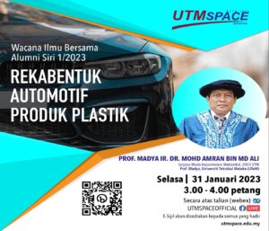 UTMSPACE telah menjemput Prof. Madya Ir. Dr. Mohd Amran bin Md Ali, Prof. Madya dan penyelidik dari UTeM untuk memberikan perkongsian kepada warga UTM/UTMSPACE menerusi FB Live UTMSPACE dan Webex. Beliau telah berkongsi mengenai idea dan cabaran ilmu automotif kepada penonton. Penceramah juga merupakan Alumni UTM bagi program Sarjana Muda Kejuruteraan (Mekanikal) (2003). Program ini telah berlangsung pada jam 3 petang bersamaan 31 Januari 2023.