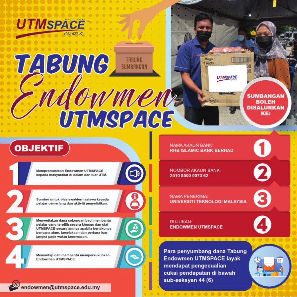The establishment of UTMSPACE Endowment Fund will help further strengthen UTM Endowment and will give great impact to UTM since all contributions to this fund will be reckoned as a gift to UTM and will be taken into account in the audit of MyRA, MyMOHES, SETARA, SDG etcetera. Contributions to UTMSPACE Endowment Fund will be regulated by the Endowment Unit and the use of funds will be determined and approved by UTMSPACE Endowment Fund Management Committee.