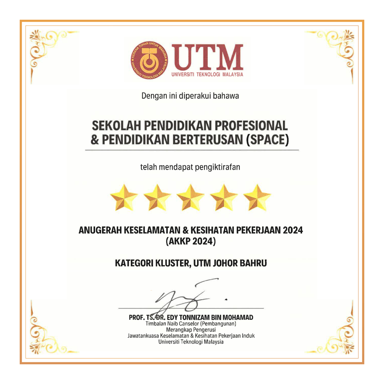 Menjadikan UTMSPACE sebagai PTJ yang mematuhi sistem Pengurusan Persekitaran, Kesihatan dan Keselamatan Pekerjaan yand diwujudkan Universiti.