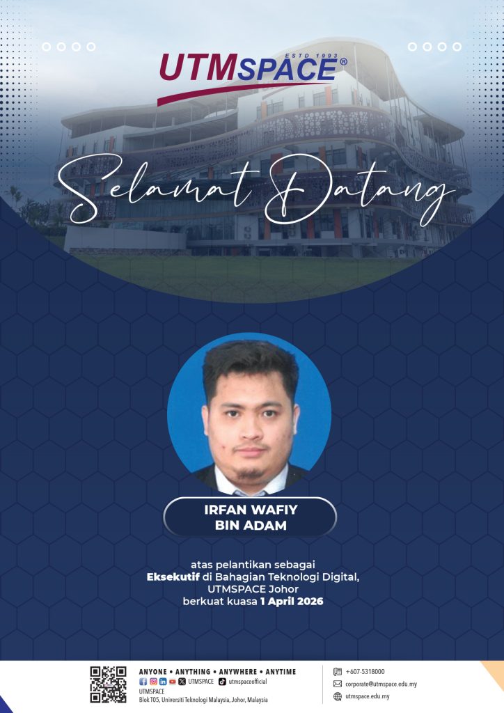 Sukacita dimaklumkan bahawa Encik Irfan Wafiy bin Adam telah dilantik sebagai Eksekutif, Bahagian Teknologi Digital, UTMSPACE Johor berkuatkuasa pada 1 April 2026.