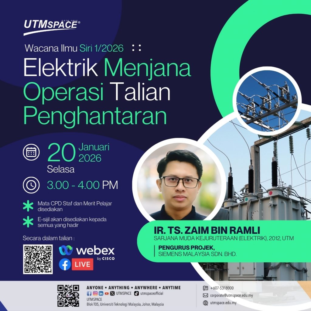 20 Januari 2026 – UTMSPACE telah menganjurkan UTMSPACE Wacana Ilmu Bersama Alumni Siri 1/2026. Program ini juga diadakan pada jam 3.00 petang yang disiarkan secara langsung di FB UTMSPACE dan Webex. Wacana ini juga telah disampaikan oleh Alumni UTM iaitu Ir. Ts. Zaim bin Ramli yang kini merupakan Pengurus Projek di Siemens Malaysia Sdn Bhd. Beliau juga telah dianugerahkan Sarjana Muda Kejuruteraan (Elektrik), 2012, UTM. Wacana pada sesi ini juga mencatatkan kehadiran atas talian seramai 85 orang yang terdiri daripada pelajar, staf, pensyarah, alumni dan masyarakat awam.