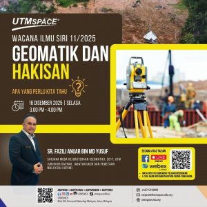 16 Disember 2025 – UTMSPACE telah menganjurkan UTMSPACE Wacana Ilmu Bersama Alumni Siri 11/2025. Program ini juga diadakan pada jam 3.00 petang yang disiarkan secara langsung di FB UTMSPACE dan Webex. Wacana ini juga telah disampaikan oleh Alumni UTM iaitu Sr. Fazili Anuar bin Md Yusof yang kini merupakan Juruukur Daerah di JUPEM. Beliau juga telah dianugerahkan Sarjana Muda Kejuruteraan (Geomatik), 2017, UTM. Wacana pada sesi ini juga mencatatkan kehadiran atas talian seramai 75 orang yang terdiri daripada pelajar, staf, pensyarah, alumni dan masyarakat awam.